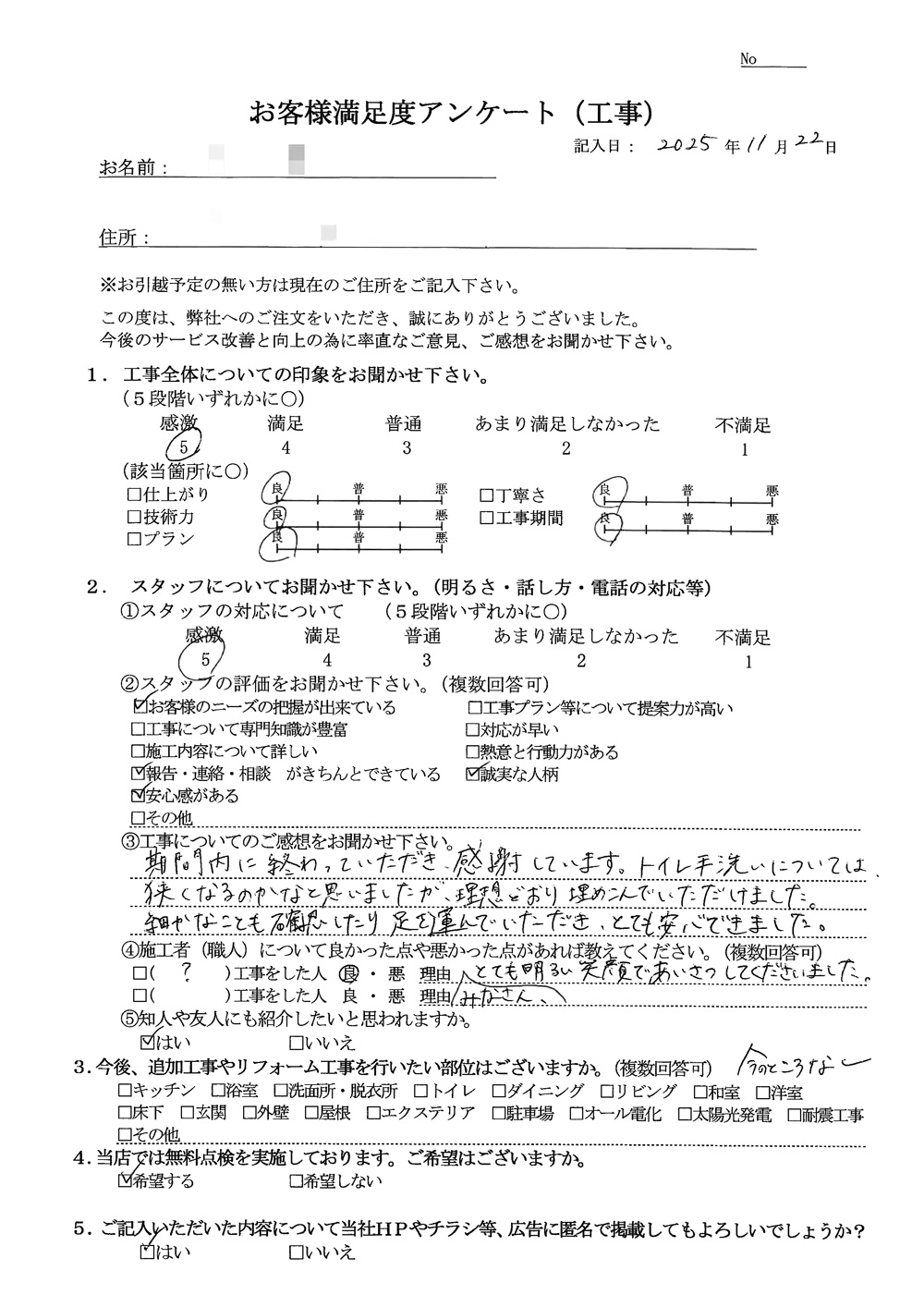 期間内に終わっていただき、感謝しています。トイレ手洗いについては、狭くなるのかなと思いましたが、理想どおり埋め込んでいただけました。細かなことも確認したり足を運んでいただき、とても安心できました。
