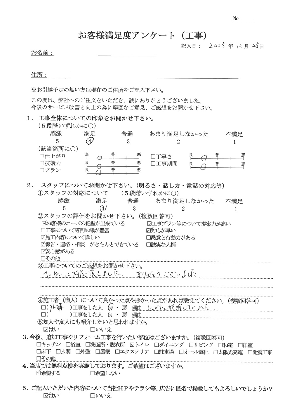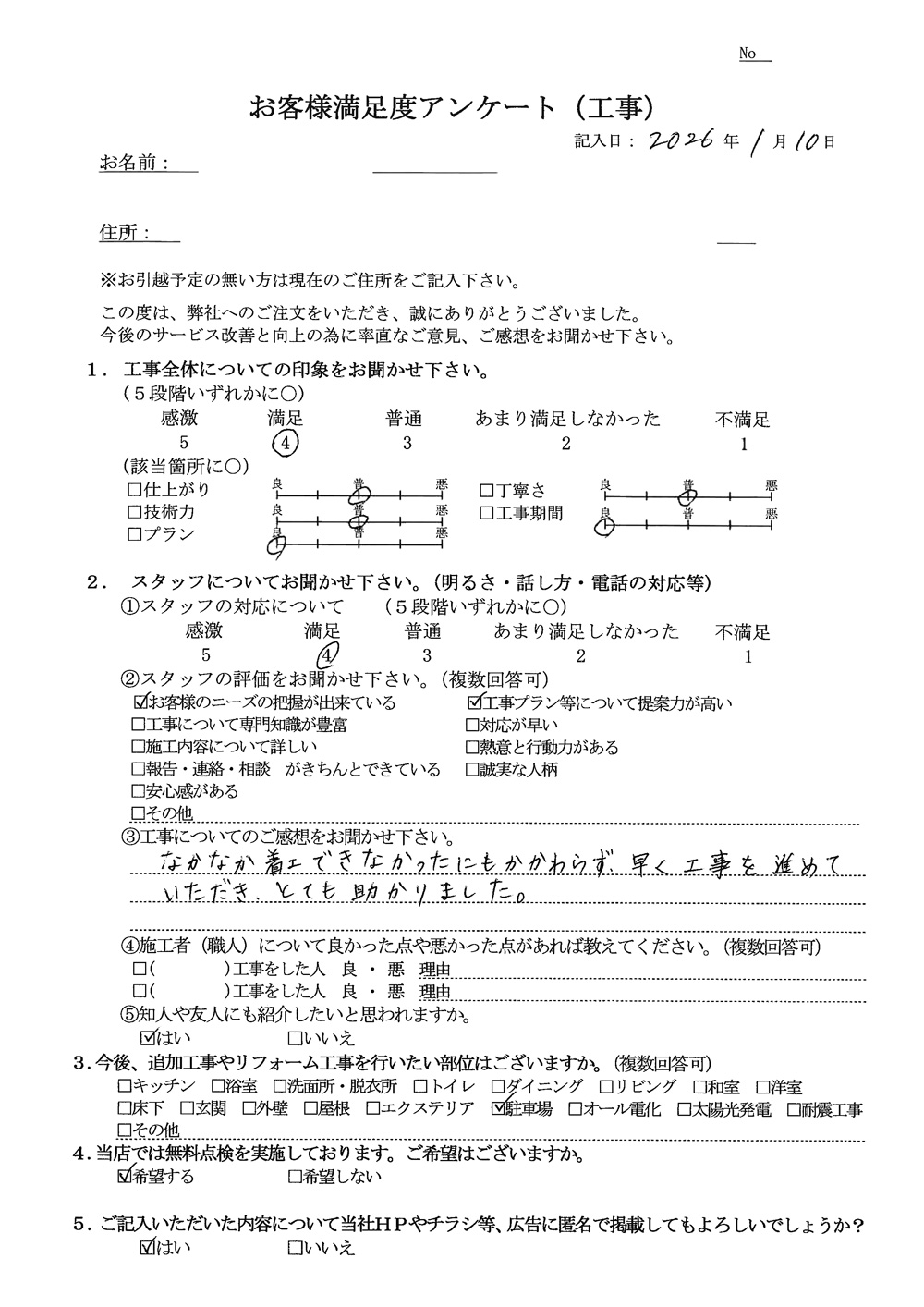 なかなか着工できなかったにもかかわらず、早く工事を進めていただき、とても助かりました。