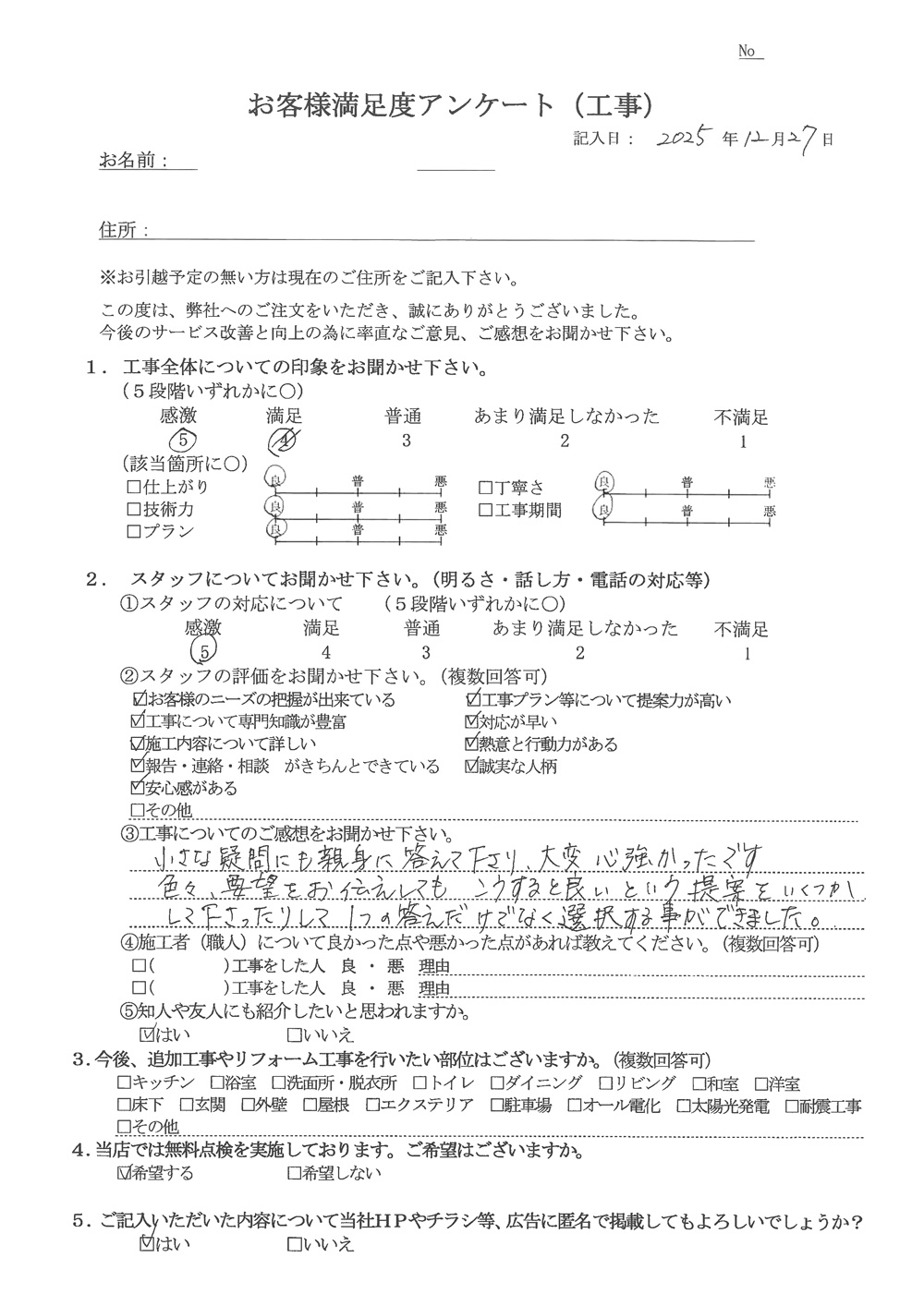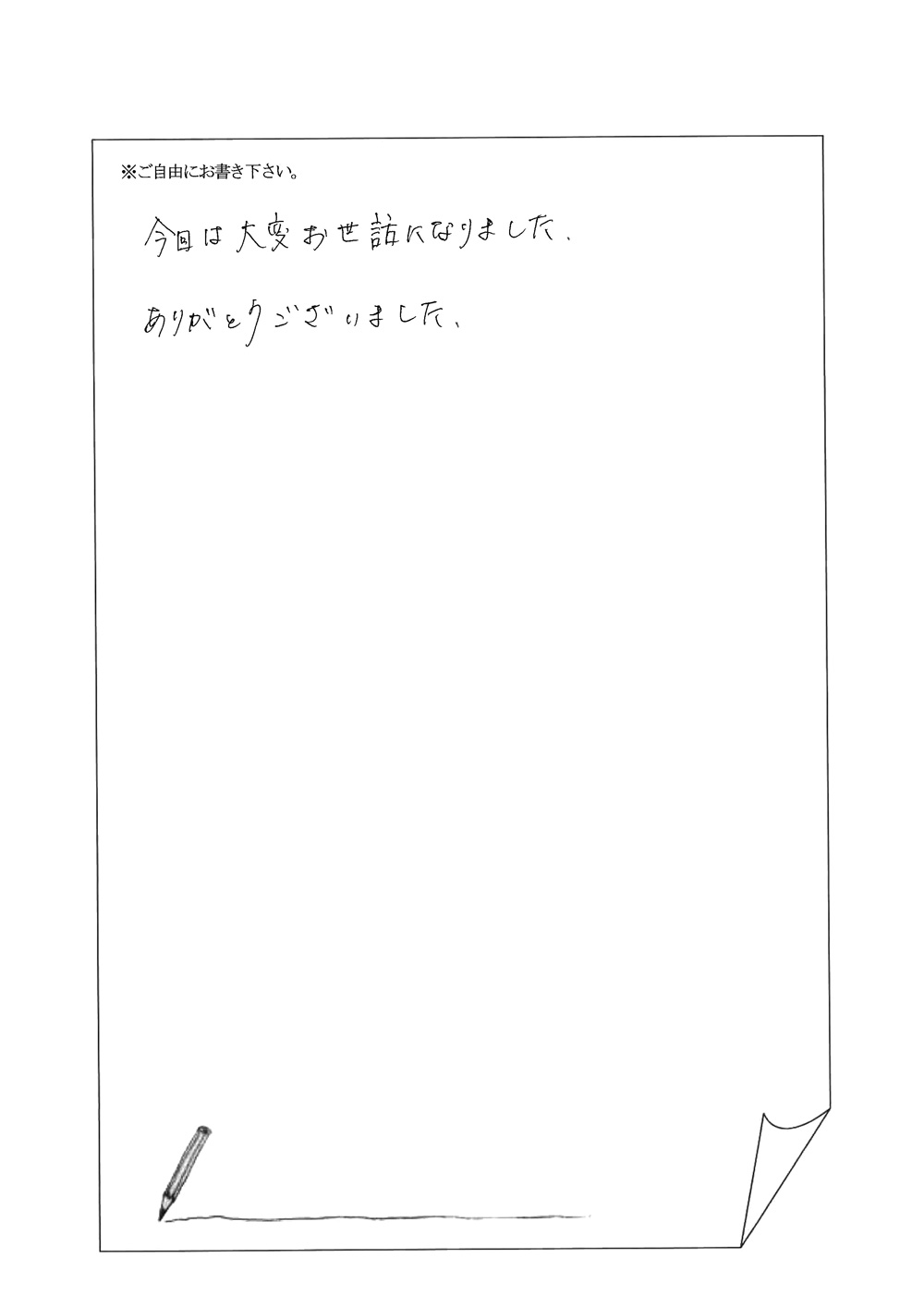 永江様には親身になってご対応いただき大変感謝をしております。 誠実なお人柄で安心して工事をお願いすることができました。ありがとうございました。